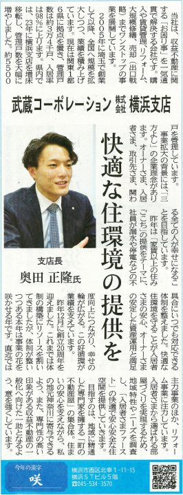 令和8年1月1日の神奈川新聞 「新春 TOP INTERVIEW 地域支える100社」にて、横浜支店長の奥田のインタビュー記事が掲載されました。
