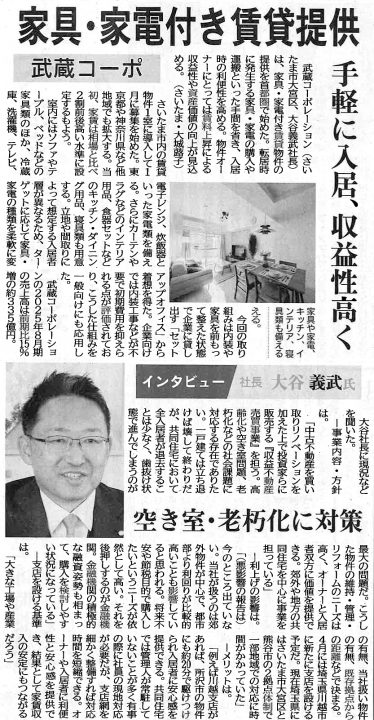 令和8年2月6日付の日刊工業新聞にて、当社が取り組む「家具・家電付き賃貸提供」の記事が掲載されました。 当社では多様化するライフスタイルに応える新たな試みとして、家具付き賃貸物件の提供を開始しました。 入居者様は初期費用を抑えて質の高い生活をスタートでき、オーナー様は競合物件との明確な差別化により、入居率の向上や資産価値の維持・向上が期待できます。 今後も現場の声を活かした三方よしの部屋づくりを追求してまいります。
