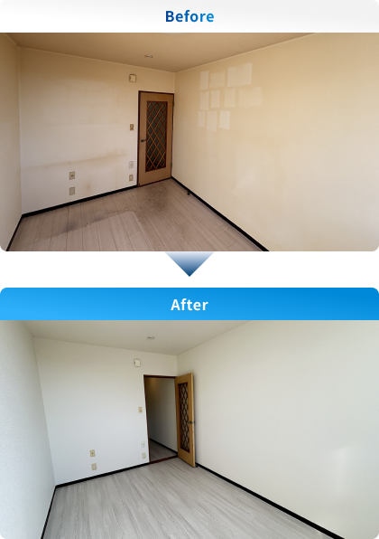フロアの色は部屋全体の印象を大きく変えます。フロアを取り替えることで部屋全体を「新築風」に見せることができます。また、張り替えも1日程度で終わるため、空室期間のロスがほとんどありません。